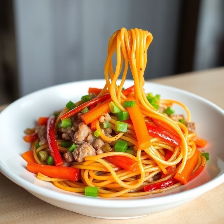 - Спагетти с курицей, перцем и томатами в папричном соусе