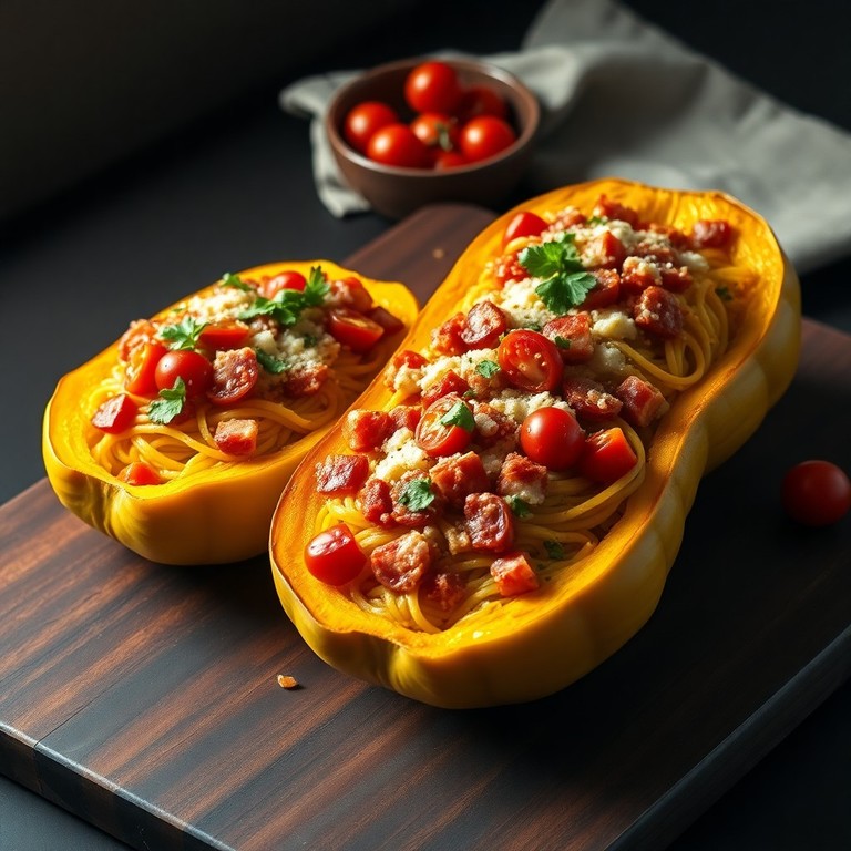 Spaghetti-Kürbis mit Schinkenwürfel und Tomaten