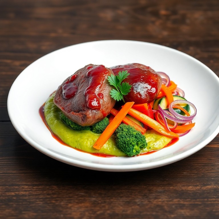 Solomo de Res en Glaseado de Kombucha de Jamaica con Vegetales Salteados y Puré de Brócoli