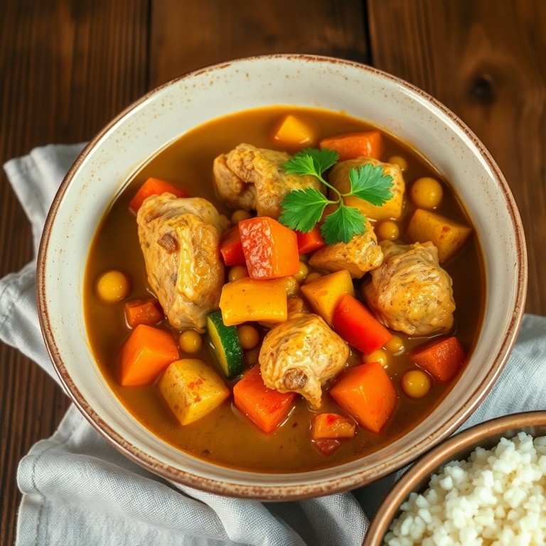 - Gebratene Kartoffeln mit Hühnerstücken in Currysauce