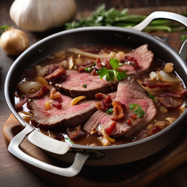 Ein herzhaftes Gericht aus saftigem Rindfleisch, Speck, Zwiebeln und Knoblauch in einer würzigen Sauce. Perfekt für ein gemütliches Abendessen.