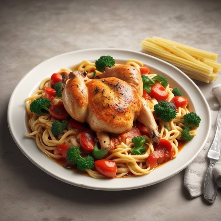 Una deliciosa receta de pollo con vegetales y pasta en una salsa de tomate casera. Perfecta para una comida reconfortante y sabrosa.