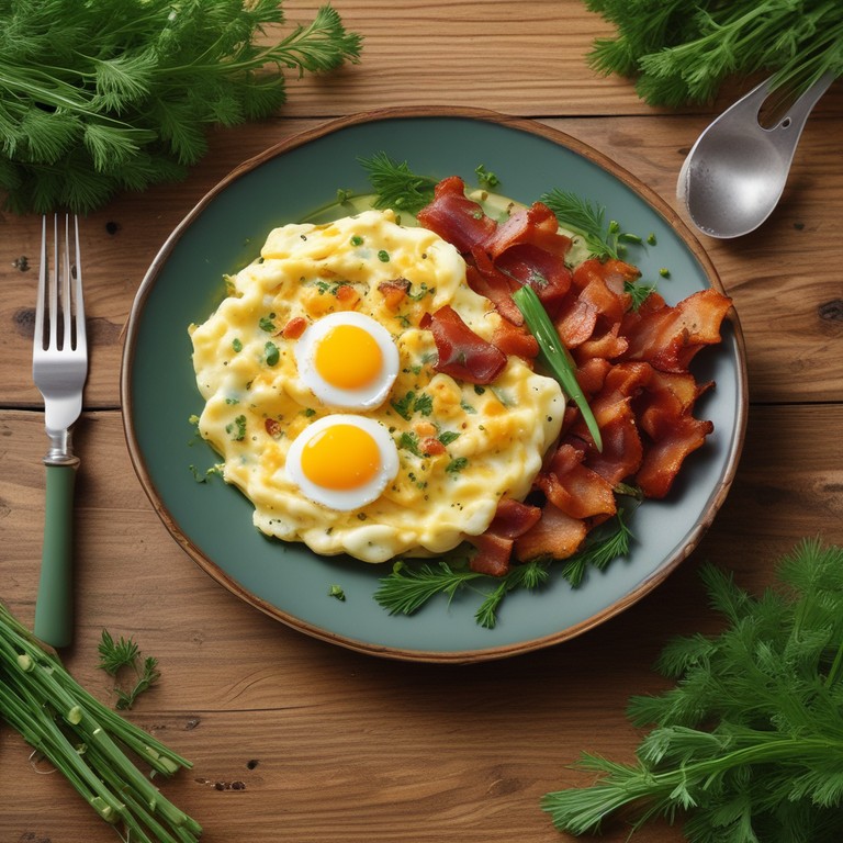 Эта яичница с беконом и зеленью - идеальный завтрак для тех, кто любит сочетание хрустящего бекона и нежных яиц. Добавление свежей зелени придает блюду особую свежесть и аромат.