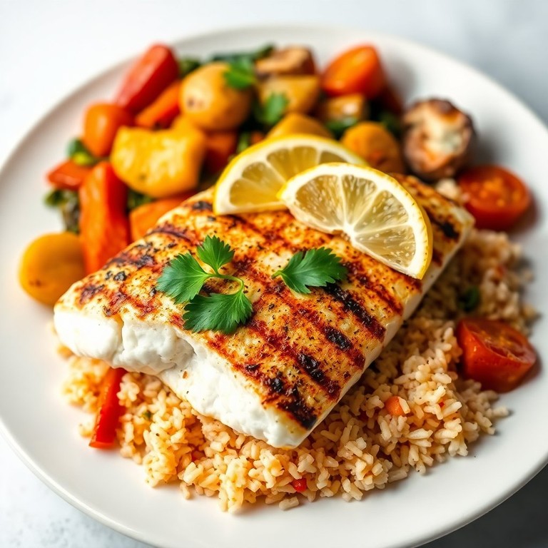 Un plato sencillo y delicioso que resalta los sabores del mar, combinando la suavidad del pescado a la plancha con el aroma del arroz y las verduras salteadas.