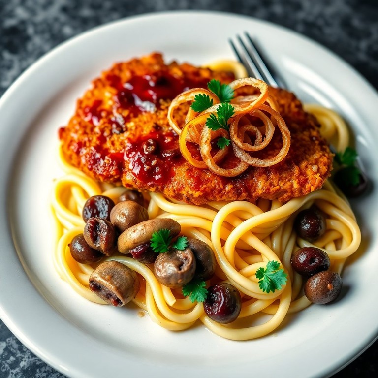 Ein klassisches deutsches Gericht, das knusprig gebratene Schweineschnitzel mit einer cremigen Pilzsauce, Spätzle und Preiselbeeren kombiniert. Perfekt für ein herzhaftes Abendessen.