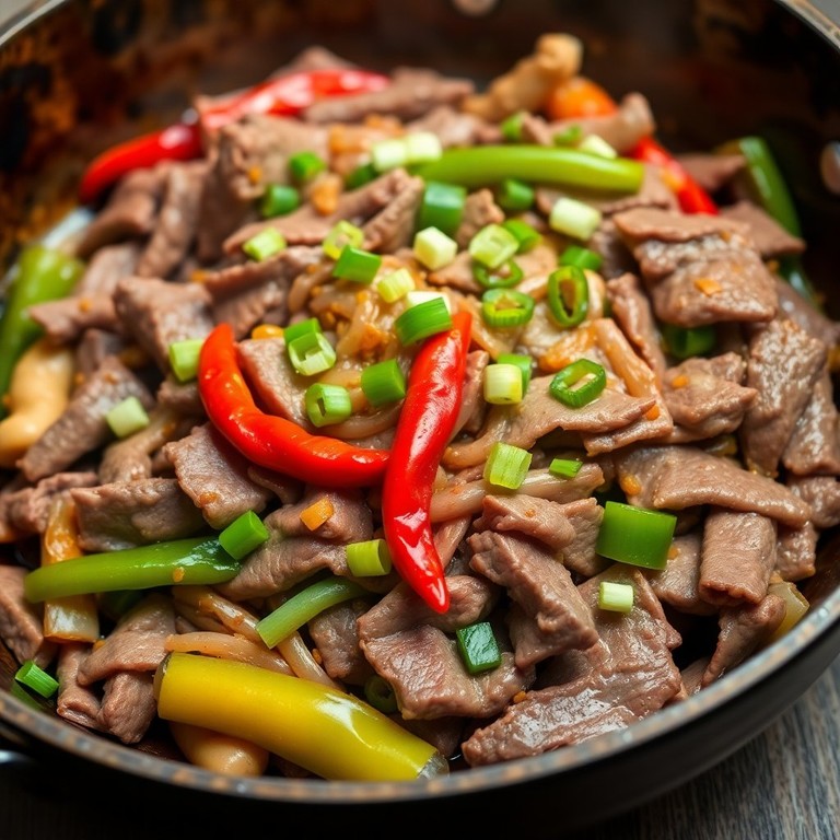 Ein würziges Gericht, das die Aromen des Fernen Ostens vereint. Diese scharfe Rindfleischpfanne kombiniert zartes Rindfleisch mit der Schärfe von Ingwer und Chili, abgerundet durch die Süße von Zwiebeln und Paprika. Perfekt für alle, die es gerne pikant mögen.