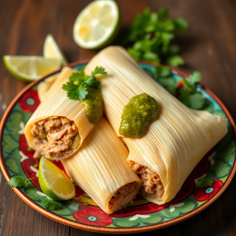 Un delicioso tamal relleno de carne de cerdo y salsa verde, envuelto en masa de maíz, perfecto para compartir en celebraciones y reuniones familiares.
