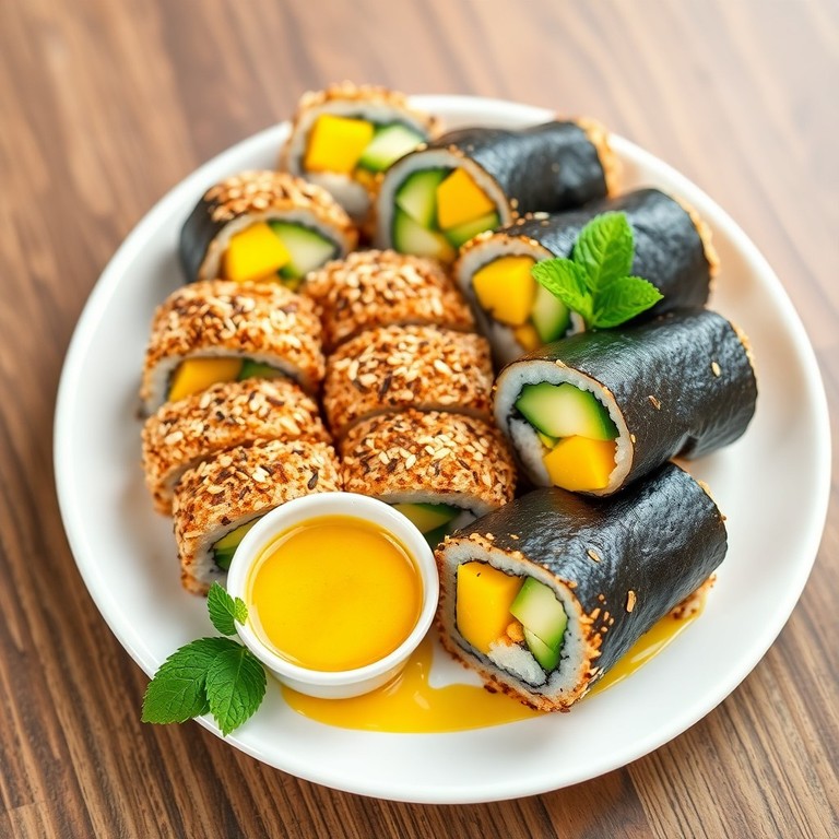 Rollitos de sushi rellenos de mango, aguacate y pepino, cubiertos de coco rallado y salsa de maracuyá. Una explosión de sabor tropical en cada bocado.