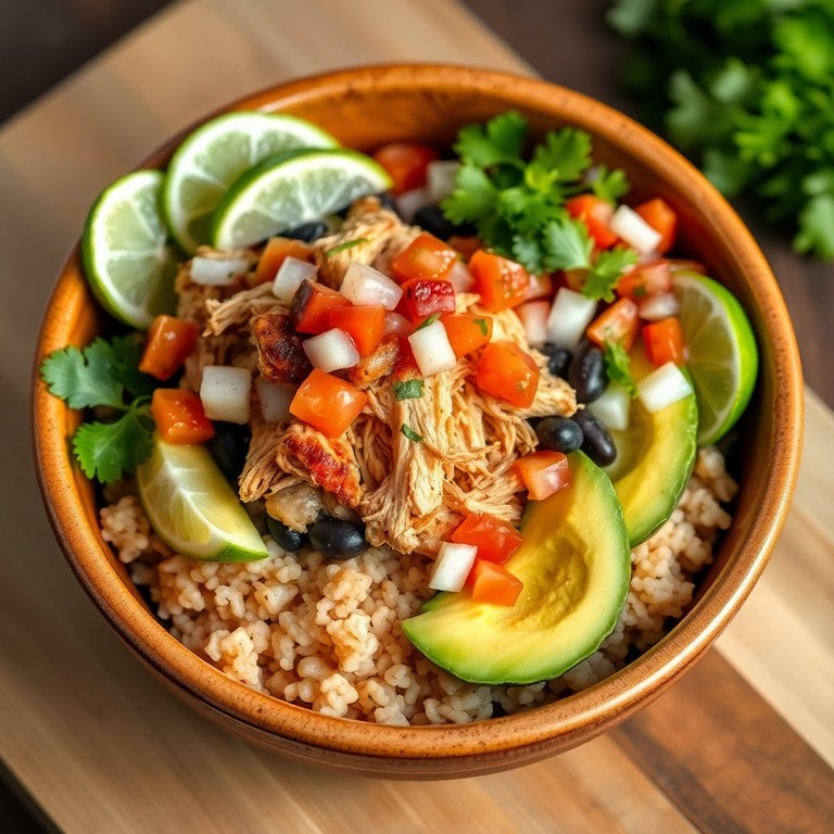 Una opción nutritiva y llena de sabor que combina pollo cocido y desmenuzado, frijoles negros, arroz integral y un fresco pico de gallo con aguacate. Ideal para una comida completa y saludable en menos de 30 minutos, perfecta para quienes buscan un plato equilibrado y lleno de texturas y colores mexicanos.