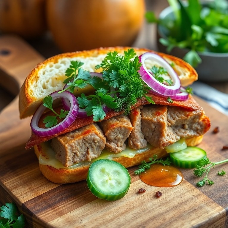Dieses herzhafte Sandwich kombiniert aromatischen Wildleberkäse mit frischen Kräutern und knusprigem Brot. Es ist schnell zubereitet und eignet sich perfekt für eine genussvolle Mittagspause oder einen schnellen Snack. Die Kombination aus warmem Leberkäse, würzigen Kräutern und cremigem Senf sorgt für ein ausgewogenes Geschmackserlebnis.