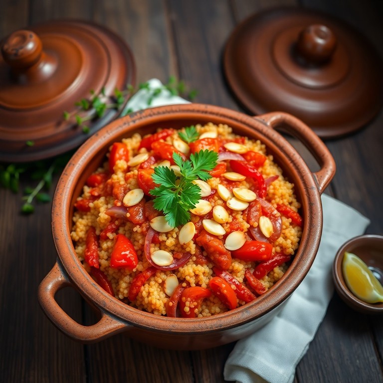 Marokkanischer Couscous-Topf mit Ajvar, Tomaten und Zwiebeln