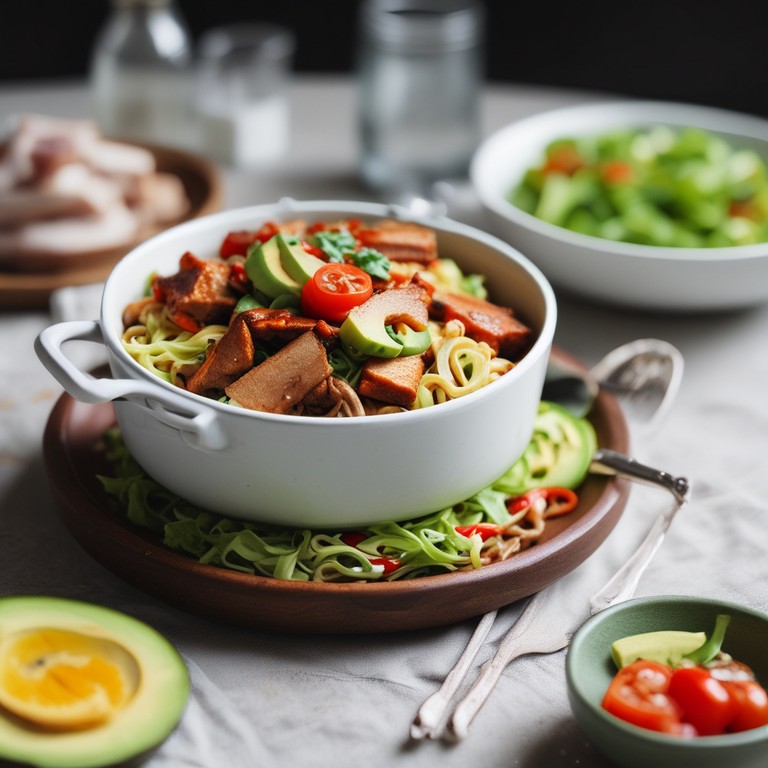 - Schweinebauch-Nudelauflauf mit Avocado-Tomatensalat