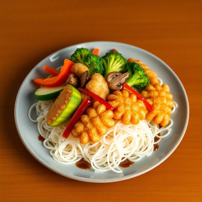 Knuspriges Gemüse-Tempura mit Reisnudeln und Sojasauce
