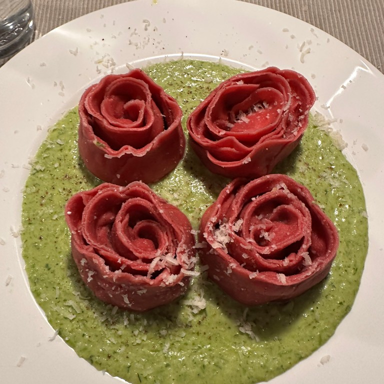 - Rote Rüben Pasta-Rosen mit Wildkräuterfülle auf Erbsen-Wildkräutersauce