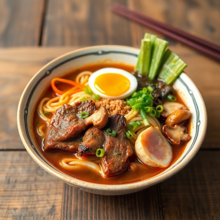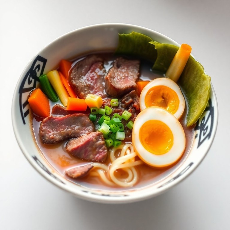 - Shoyu-Ramen mit marinierten Rinderhüfte und buntem Gemüse