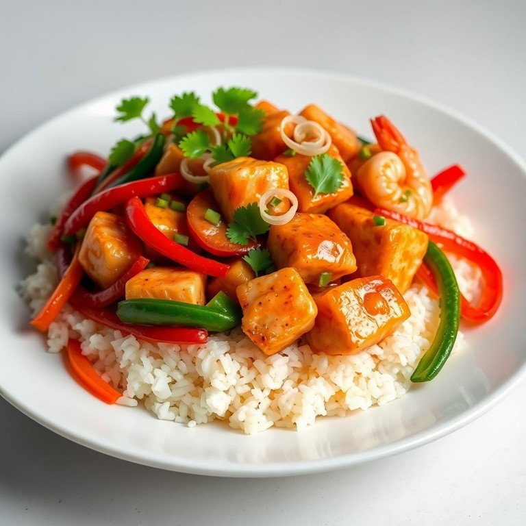 - Asiatisches Fischgericht mit Scampi, Reis und Gemüse
