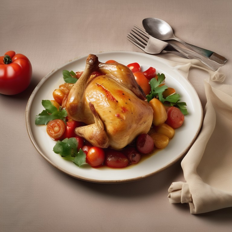 Poulet entier aux poivrons, pommes de terre et tomates cerises