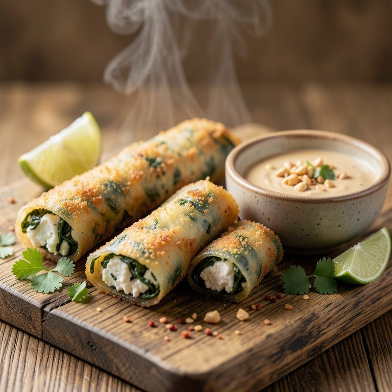 - Knusprige Spinat-Reispapier-Röllchen mit Erdnuss-Dip