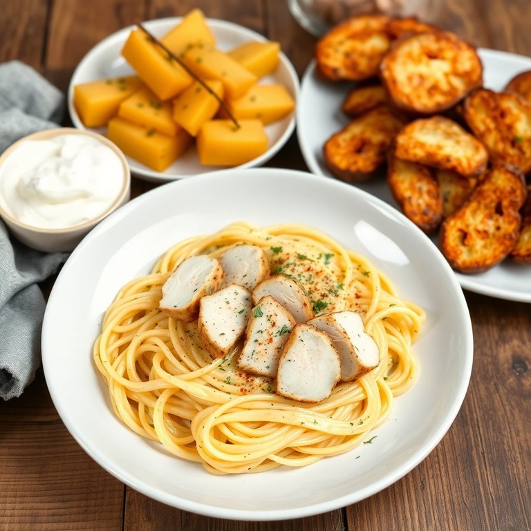 Hühnerbrust in cremiger Spaghettikürbis-Sauce mit knusprigen Kartoffeln