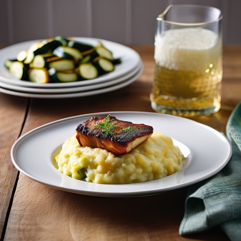 Gebackener Seibling mit Safran-Kartoffelpüree und cremigem Blumenkohl-Zucchini-Gratin