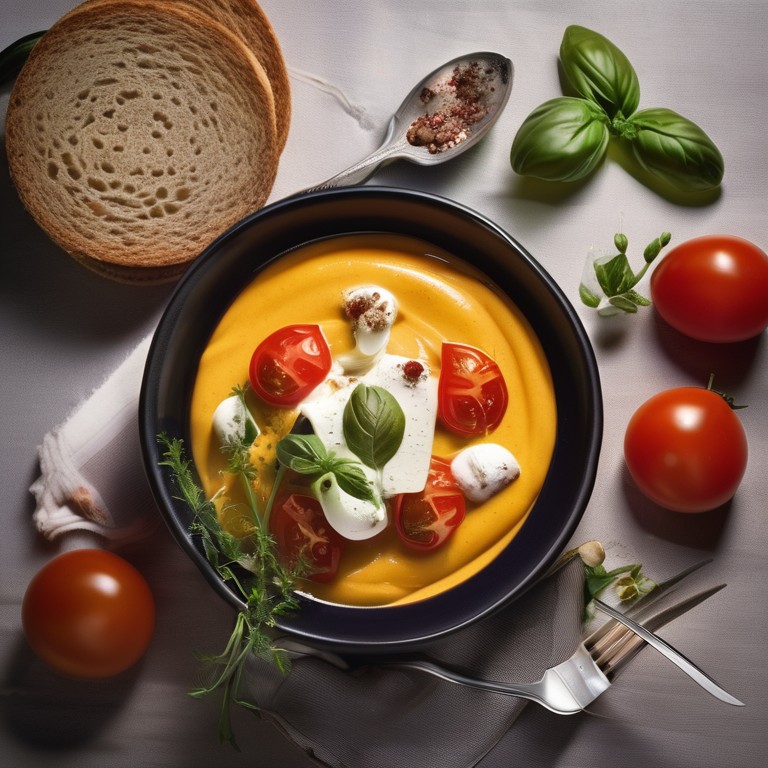 Tomatenmousse als Vorspeise mit Basilikumpesto, Büffelmozzarella, Oliven und Rauke
