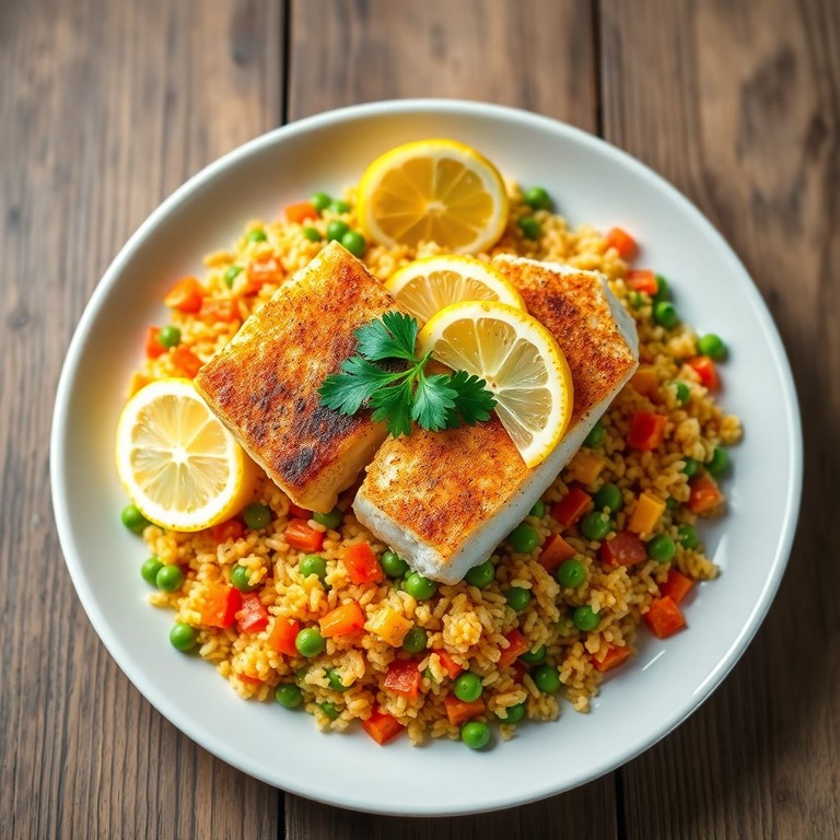 Knuspriger gebratener Fisch mit buntem Gemüse-Reis