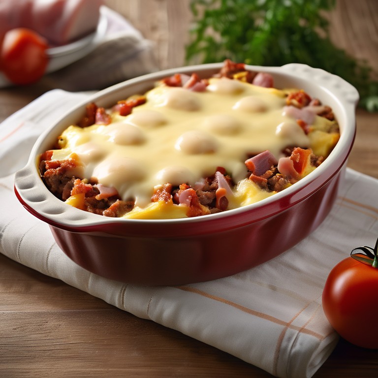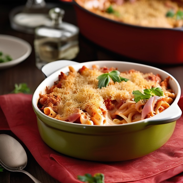 Tomaten-Hühnernudelauflauf mit Schinken und Käse