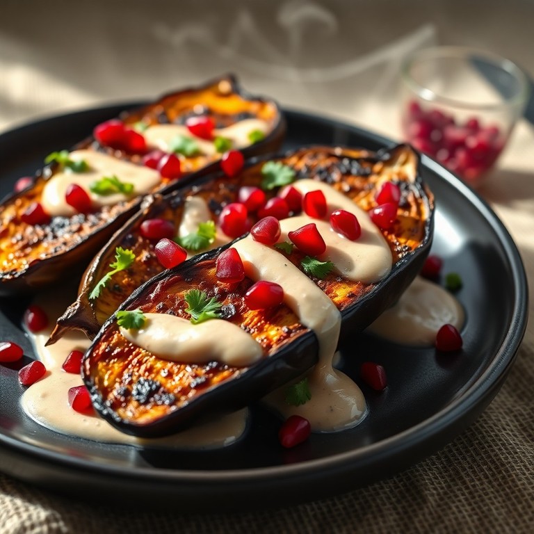 - Geröstete Auberginen mit Tahini und Granatapfelkernen