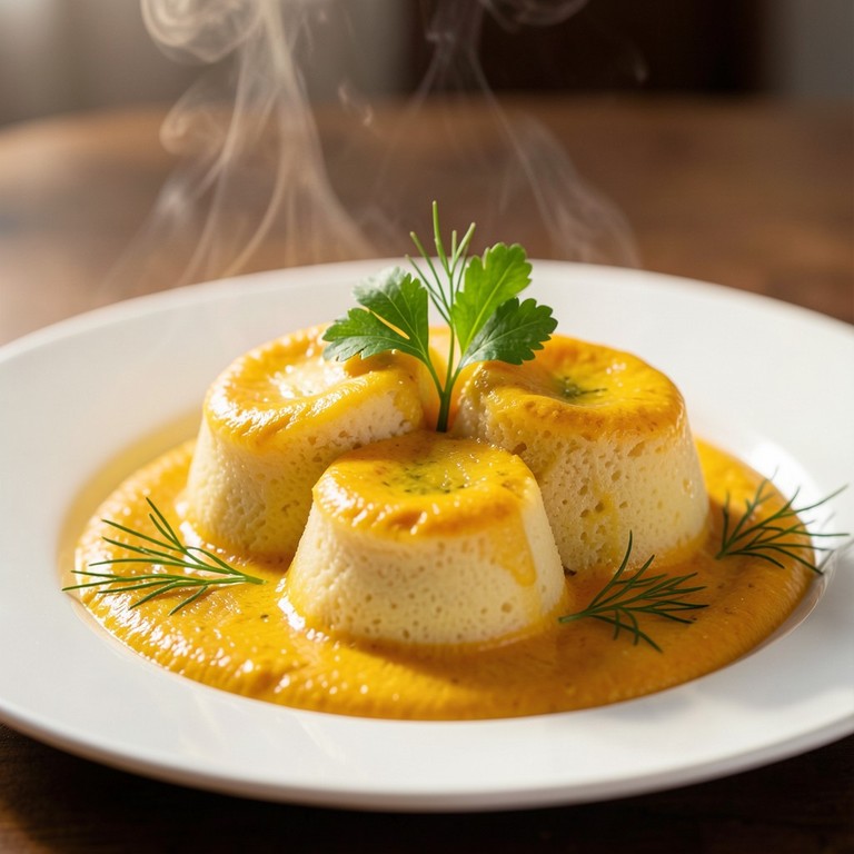 - Gedämpfte Hecht-Soufflé-Röllchen mit Safran-Bisque