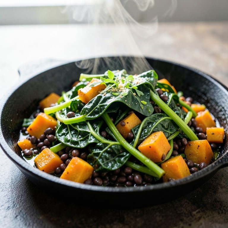 - Gebratener Mangold mit Kürbis und Beluga-Linsen
