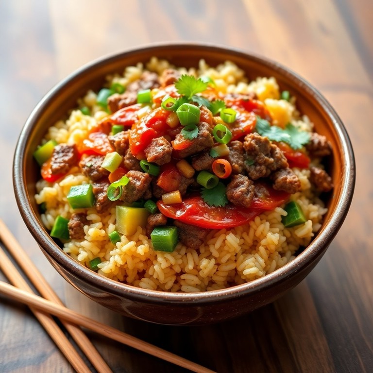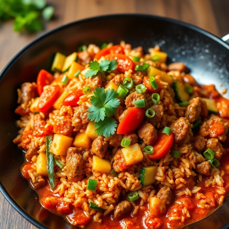 Riz sauté épicé à la viande et aux légumes (version juliennes de légumes)
