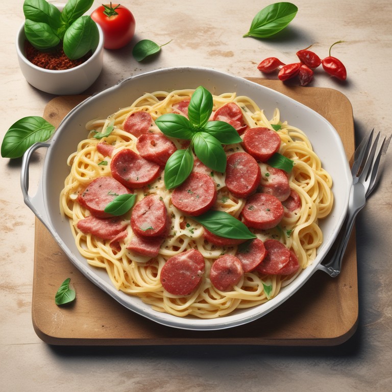 Cremige Frischkäse-Spaghetti mit Salami
