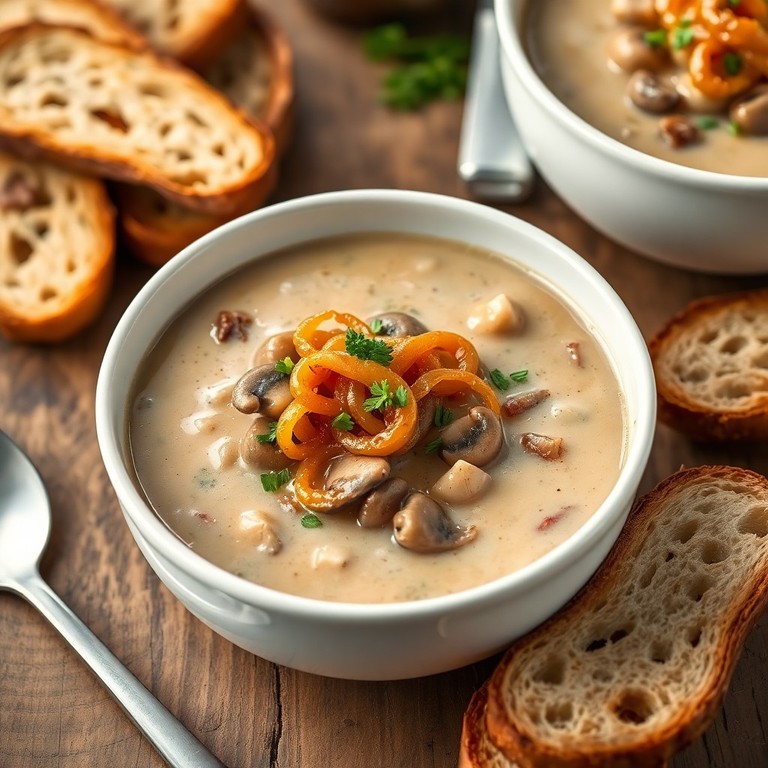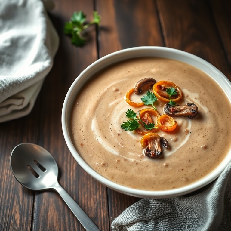 Sopa cremosa de champiñones y cebolla caramelizada con toque de pollo