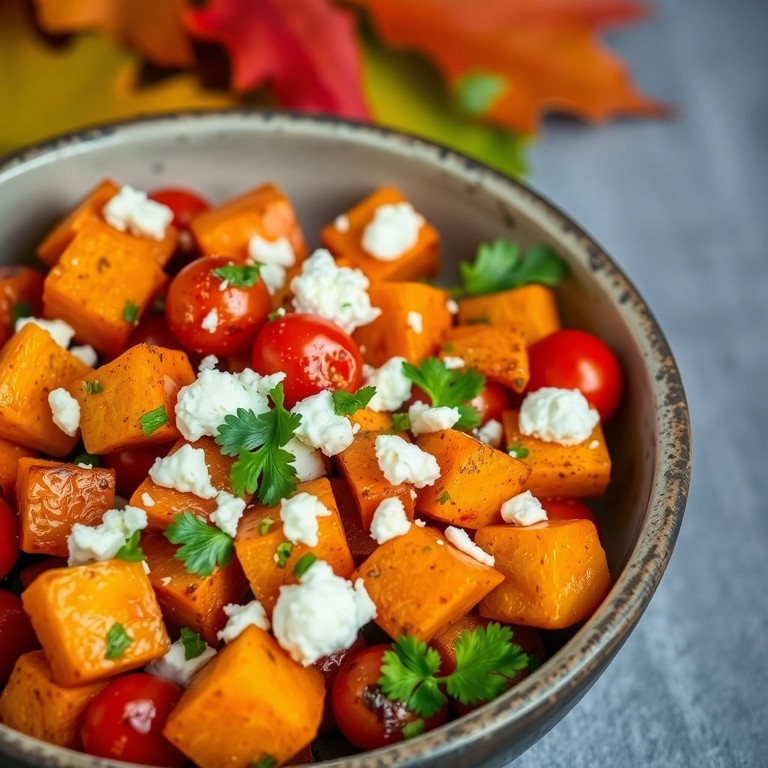 Herbstlicher Kürbis-Tomaten-Salat mit geröstetem Kürbis, saftigen Tomaten und zerbröckeltem Feta