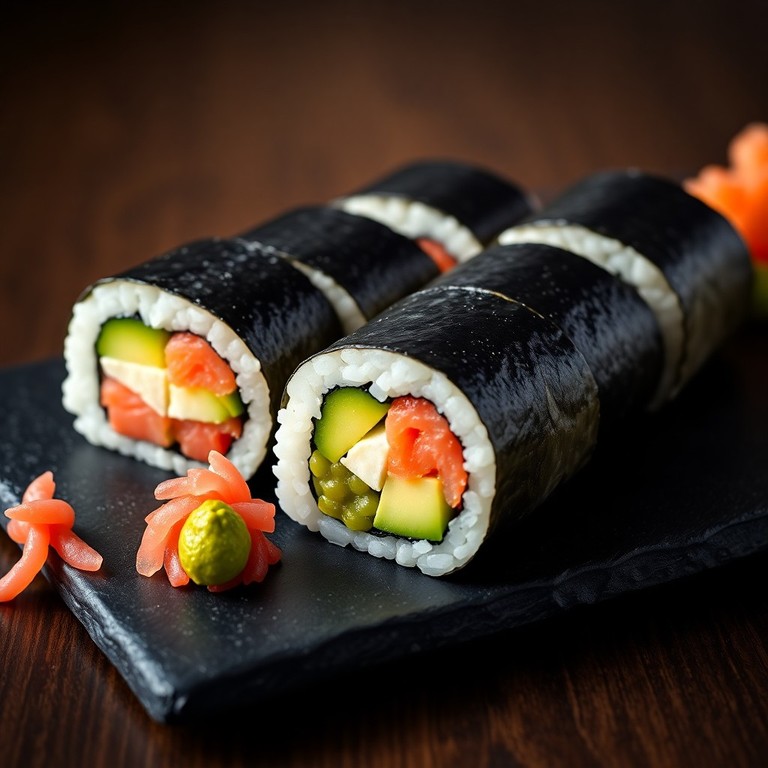Klassische Maki-Rollen mit Lachs, Avocado und Gurke