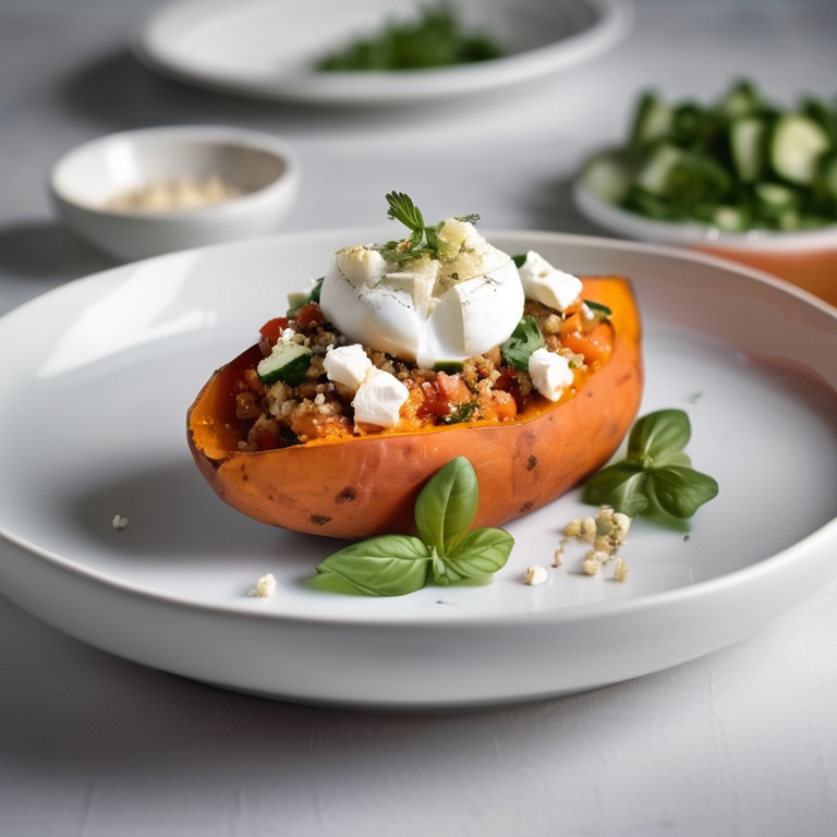 Gebackene Süßkartoffel mit Quinoa, Tomate, Feta, Burrata und Gurke