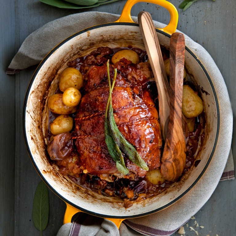 Gestoofde varkensschouder met abrikozen, amandelen, salie en krieltjes