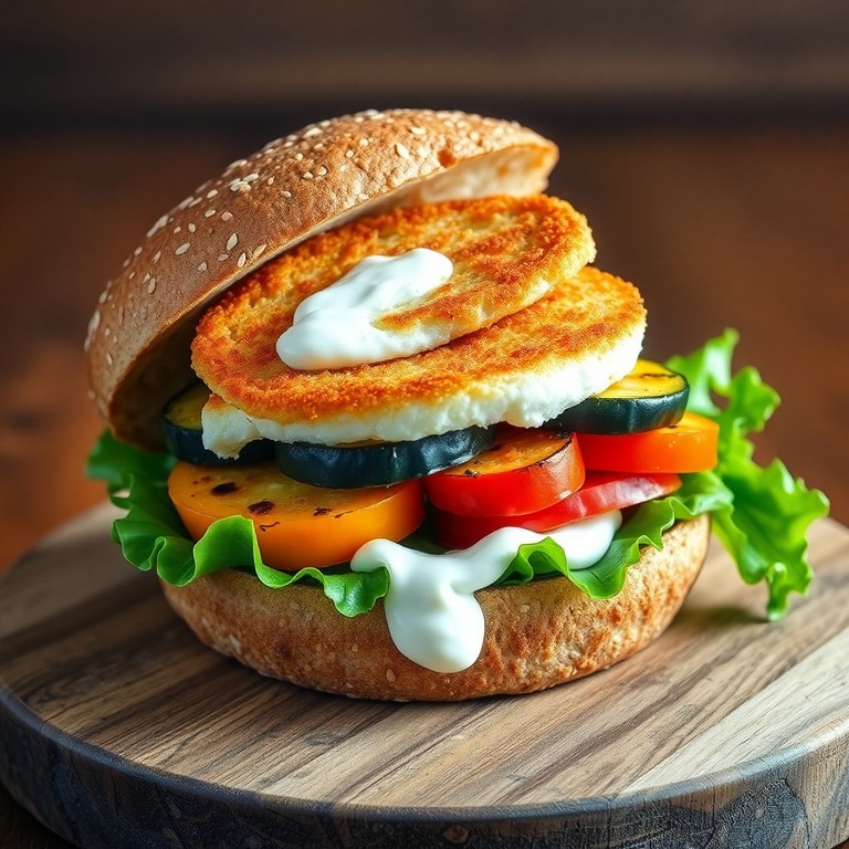 Vollkornburger mit gebackenem Fetakäse und gegrilltem Gemüse
