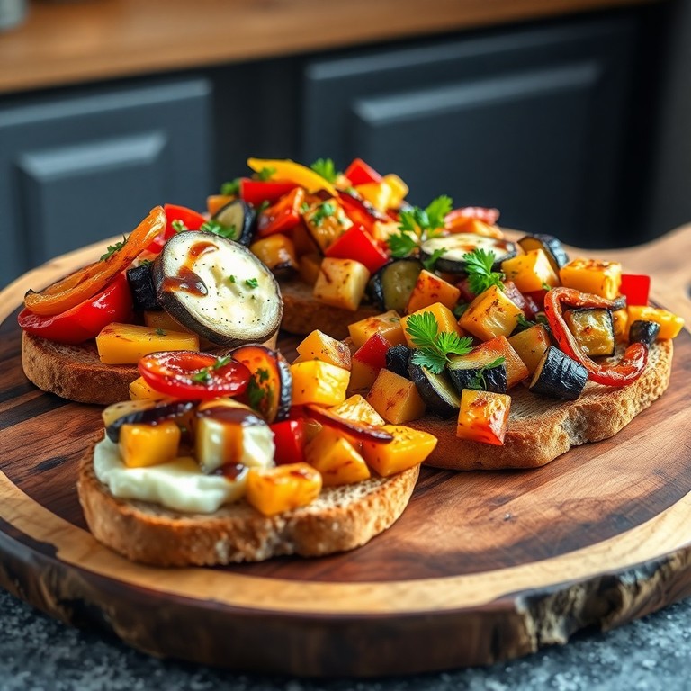 Geröstetes Vollkornbrot mit Weichkäse und geröstetem Gemüse