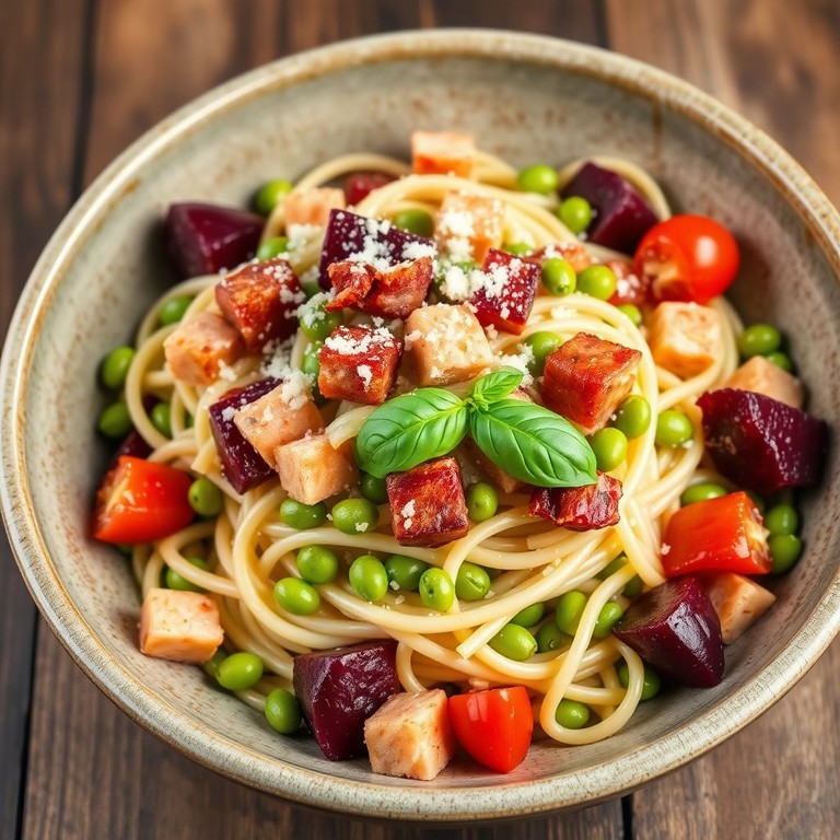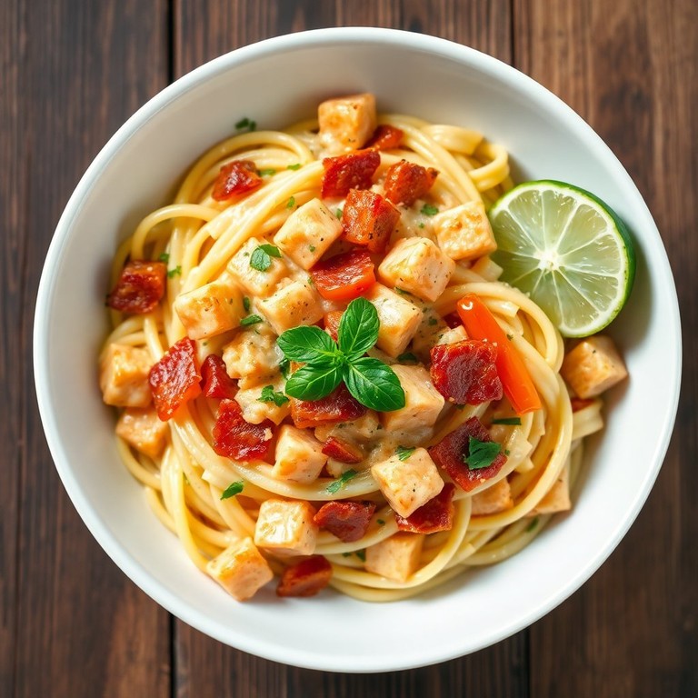 Cremige Pasta mit Speckwürfeln und buntem Paprika