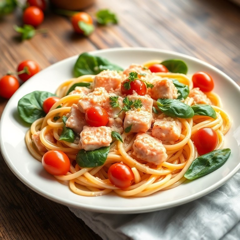 Lachs-Pasta mit Tomaten und Spinat