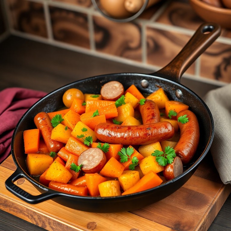 Bunte Möhren-Kartoffel-Pfanne mit Würstchen