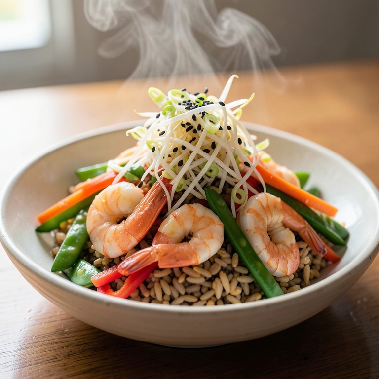Garnelen-Gemüse-Bowl mit braunem Reis und Sojasprossen