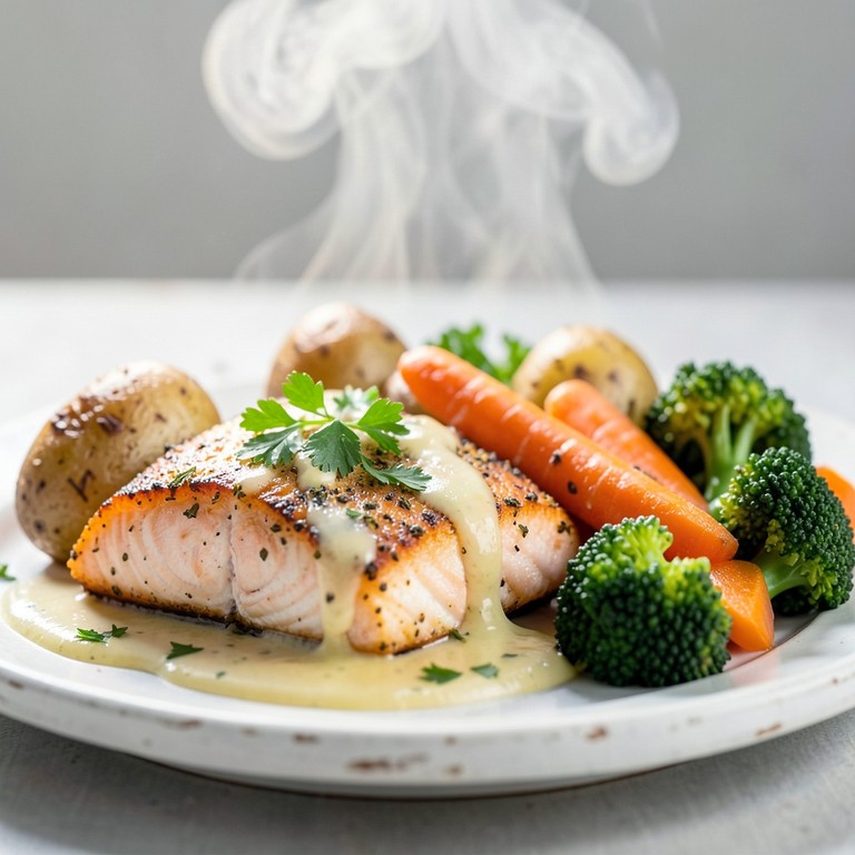 - Ofenlachs mit Rosmarinkartoffeln und buntem Gemüse