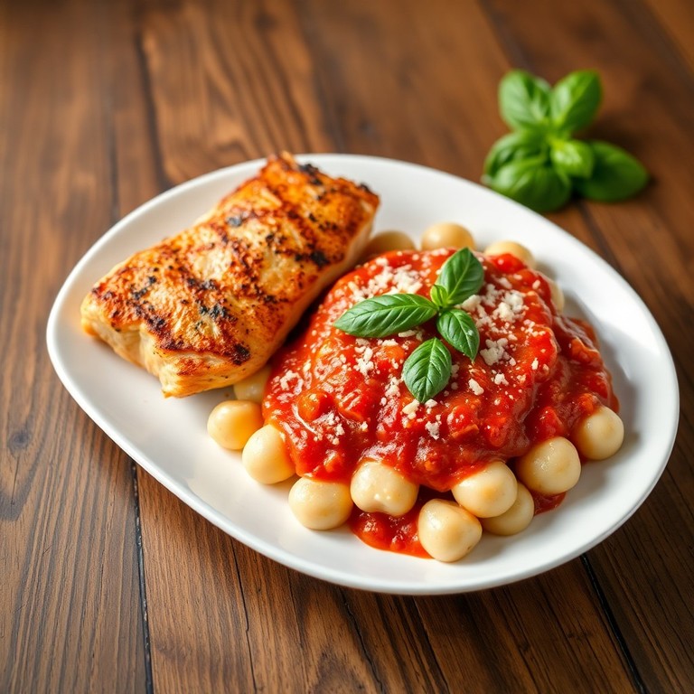 Gebratene Hähnchenbrust mit cremigen Gnocchi in Tomatensugo