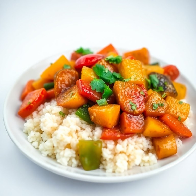 Paprika-Karotten-Pfanne mit Reis und Kartoffeln