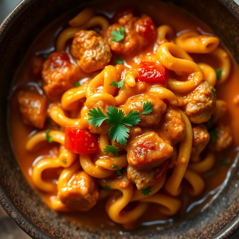 Cremige Nudelpfanne mit Putengulasch und Schmelzkäse
