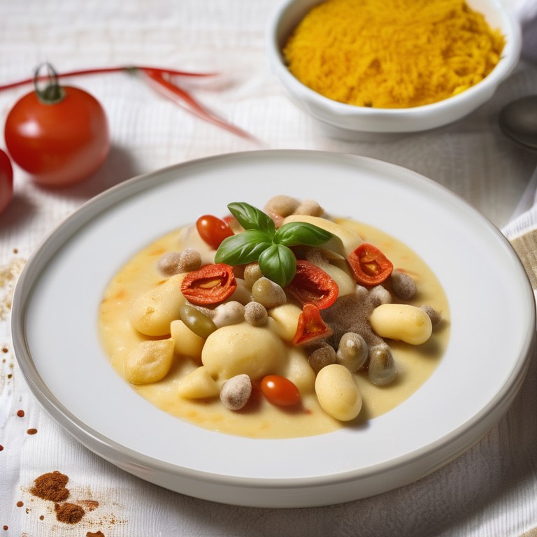 Gnocchi mit Pilzen und Käse in pikantem Hummus-Sauce