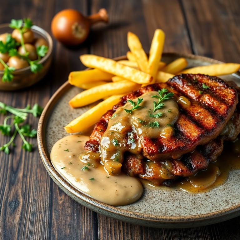 Zwiebelrostbraten im Ofen gebraten mit hausgemachten Pommes und würziger Zwiebelsauce
