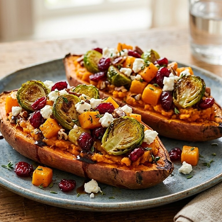 Süßkartoffel-Boote mit gerösteten Rosenkohl, Butternut-Kürbis, Cranberries und Ziegenkäse